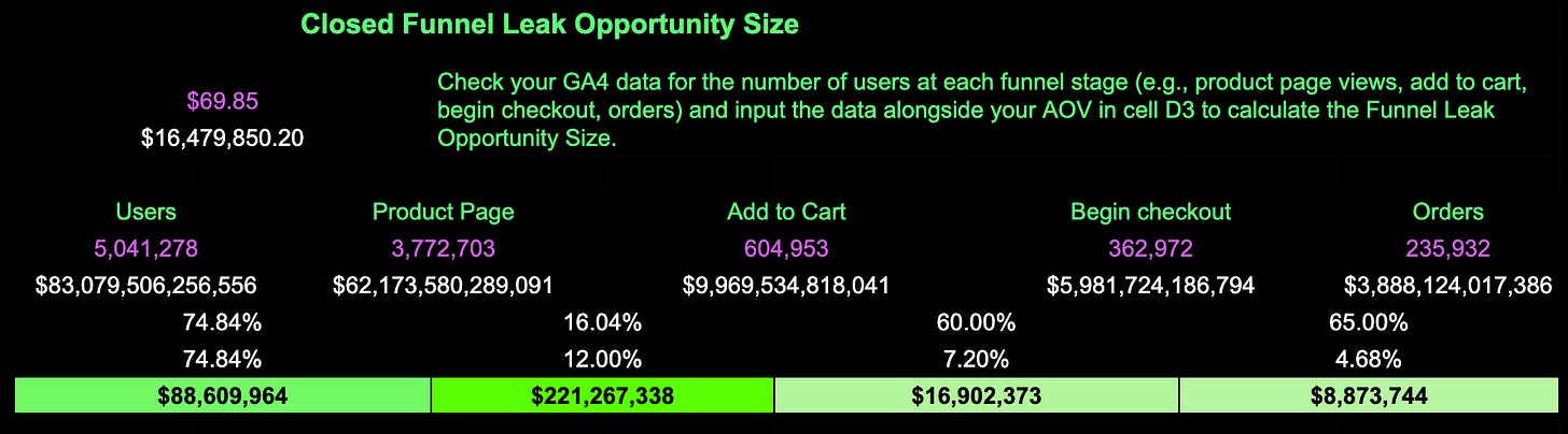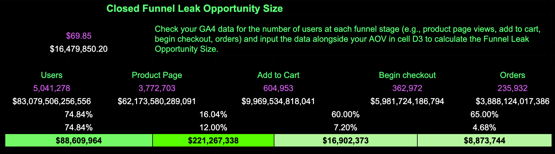 I like to then run it through my calculator to pinpoint the largest leakages in the funnel (simply multiply user counts by AOV for each stage) and benchmark it against competitors in the industry.