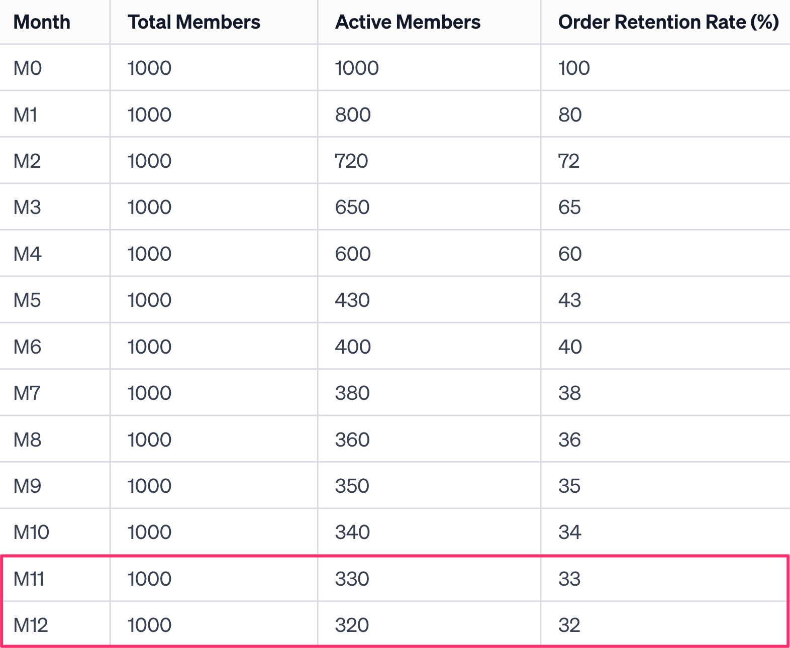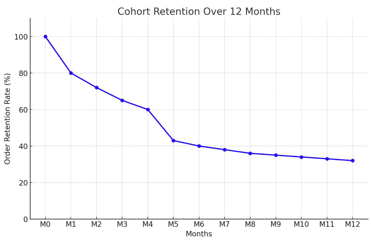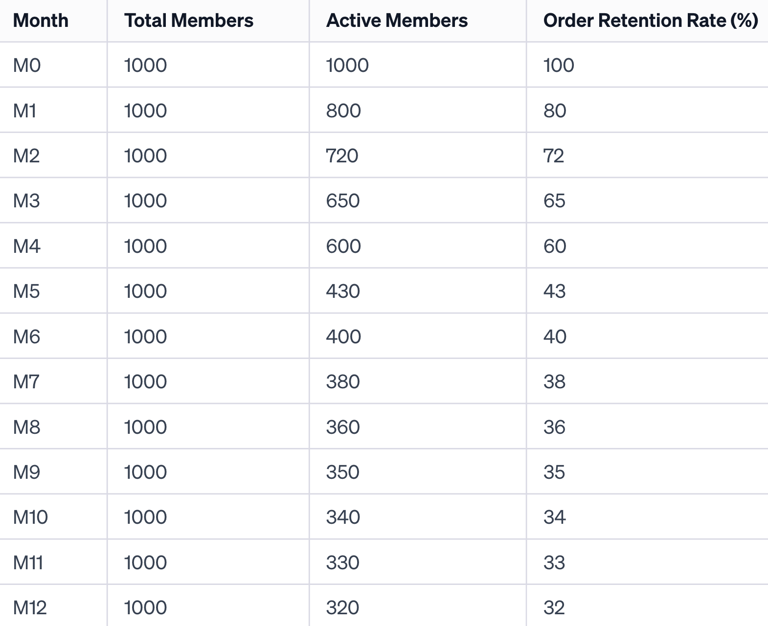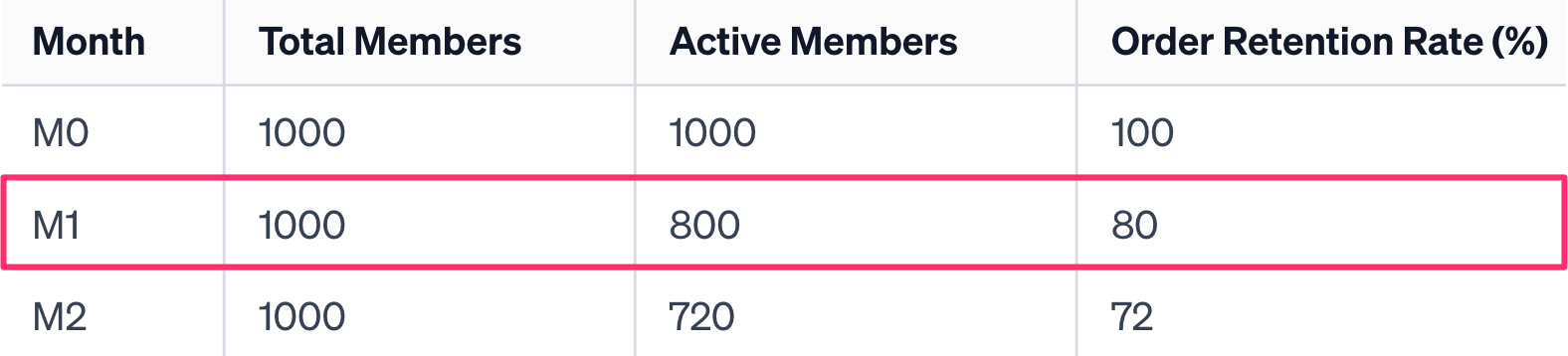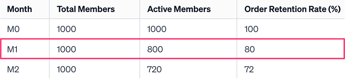 This means that our order retention rate for the January Cohort in M1 is 80% (800/1000).