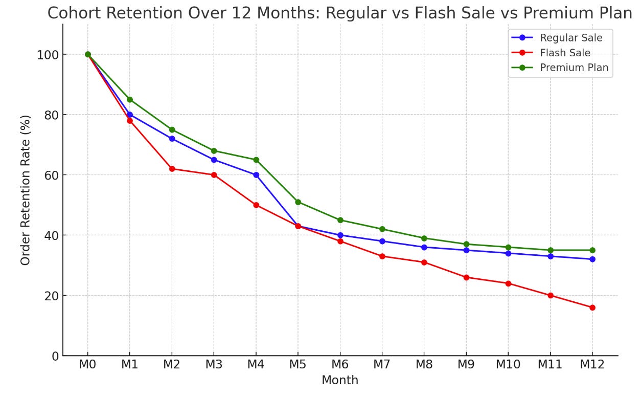 In contrast, customers acquired through the Flash Sale Campaign demonstrate a markedly quicker decline in retention.