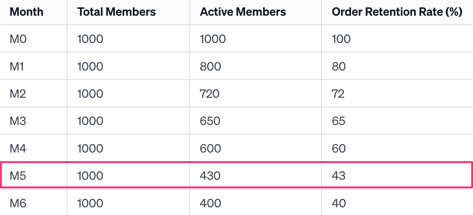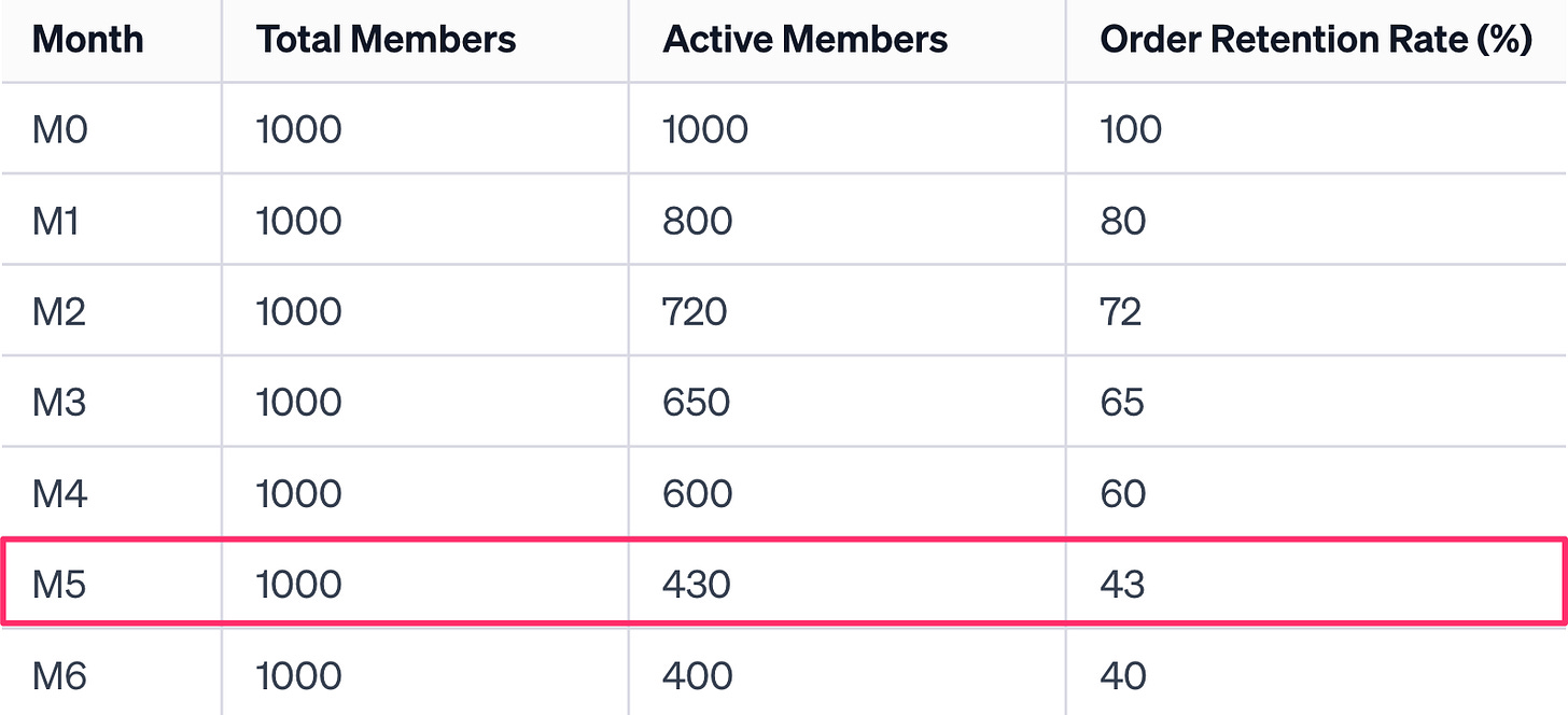 Fast forward to the fifth month (M5), and 430 members are still actively purchasing.